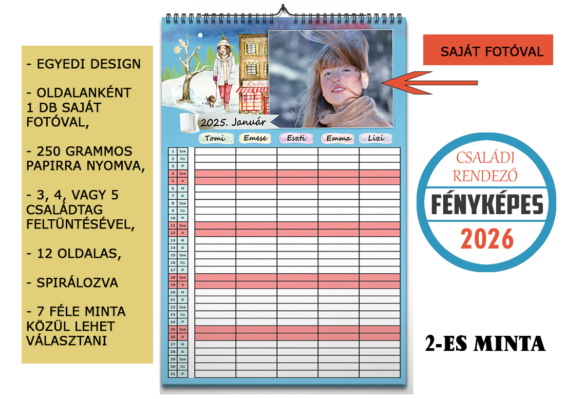Praktikus és stílusos 2026-os családi rendező naptár, amely segít nyomon követni a család minden tagjának programját. A családi rendező naptár egy olyan eszköz, amely 1 éven keresztül gyűjti össze családtagjaid tevékenységeit, programjait. Mindenki saját oszlopban rögzítheti az eseményeket, átlátva így a másik programjait is. A 12 db fotót, ami a naptároldalakhoz szükséges emailben várom, de a visszaigazolásban ezt is részletesen megírom neked. Ha elkészült a naptár váza, egy link segítségével fogom megküldeni szemrevételezésre. Utalásod után indul a naptár nyomtatása, majd az általad választott postázási móddal hozzád. Kérlek mindenképpen olvasd tovább!