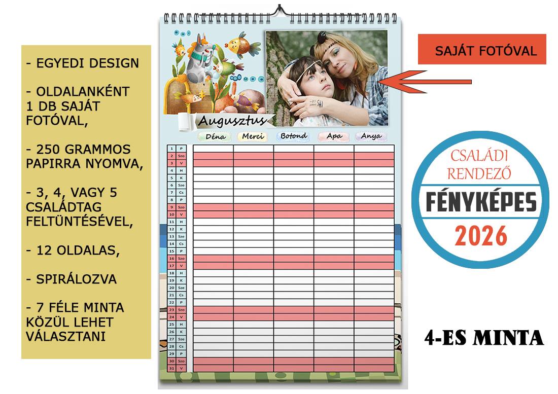 Praktikus és stílusos 2026-os családi rendező naptár, amely segít nyomon követni a család minden tagjának programját. A családi rendező naptár egy olyan eszköz, amely 1 éven keresztül gyűjti össze családtagjaid tevékenységeit, programjait. Mindenki saját oszlopban rögzítheti az eseményeket, átlátva így a másik programjait is. A 12 db fotót, ami a naptároldalakhoz szükséges emailben várom, de a visszaigazolásban ezt is részletesen megírom neked. Ha elkészült a naptár váza, egy link segítségével fogom megküldeni szemrevételezésre. Utalásod után indul a naptár nyomtatása, majd az általad választott postázási móddal hozzád. Kérlek mindenképpen olvasd tovább!