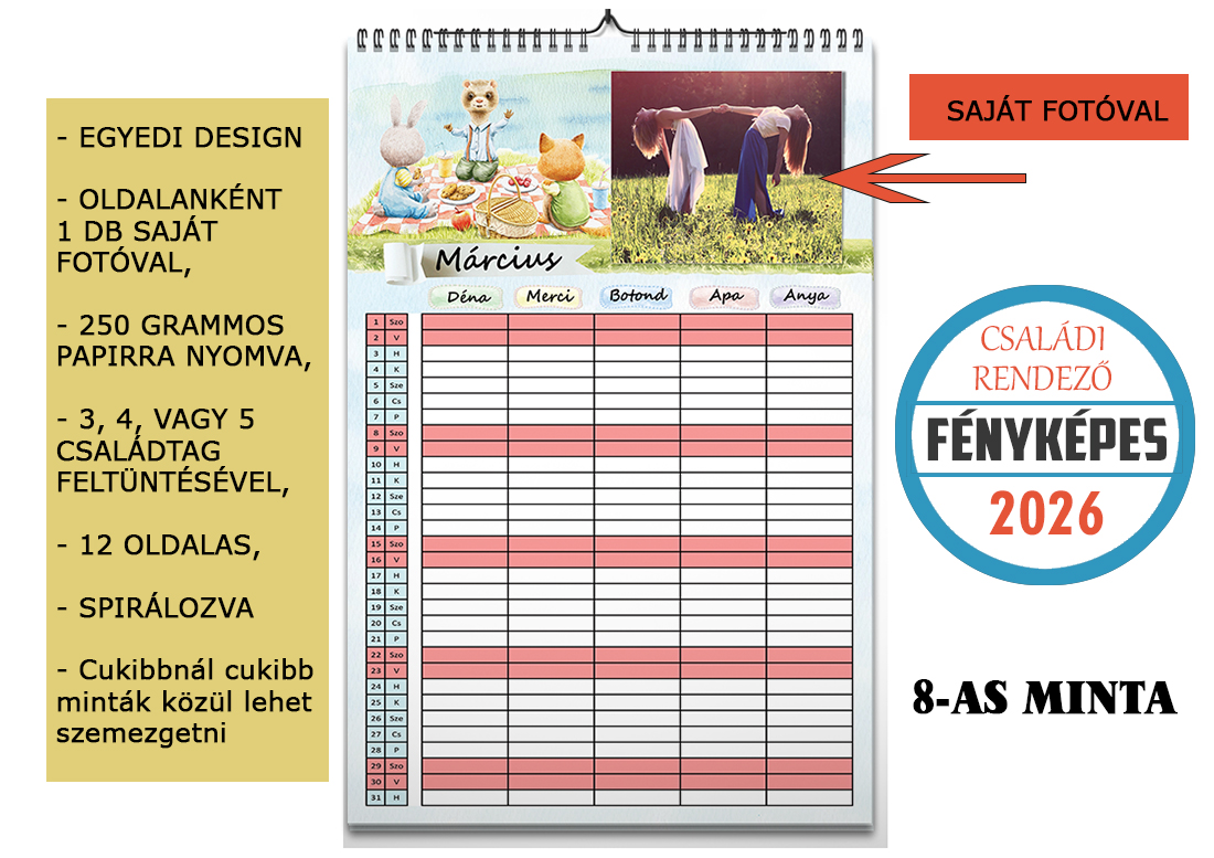 Praktikus és stílusos 2026-os családi rendező naptár, amely segít nyomon követni a család minden tagjának programját. A családi rendező naptár egy olyan eszköz, amely 1 éven keresztül gyűjti össze családtagjaid tevékenységeit, programjait. Mindenki saját oszlopban rögzítheti az eseményeket, átlátva így a másik programjait is. A 12 db fotót, ami a naptároldalakhoz szükséges emailben várom, de a visszaigazolásban ezt is részletesen megírom neked. Ha elkészült a naptár váza, egy link segítségével fogom megküldeni szemrevételezésre. Utalásod után indul a naptár nyomtatása, majd az általad választott postázási móddal hozzád. Kérlek mindenképpen olvasd tovább!